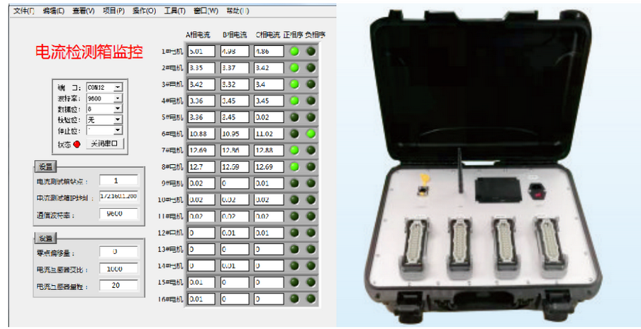電流檢測(cè)箱是一款可以同時(shí)測(cè)多路三相用電設(shè)備的電流和相序數(shù)據(jù)便攜式設(shè)備,通過配帶的電流鉗夾,在不改變被測(cè)線路的條件下,單個(gè)電流測(cè)試箱最多可同時(shí)測(cè)量16個(gè)電機(jī)的三相電流和相序,測(cè)試數(shù)據(jù)通過MODBUS通信協(xié)議傳輸至電腦或PLC,支持二次開發(fā)。